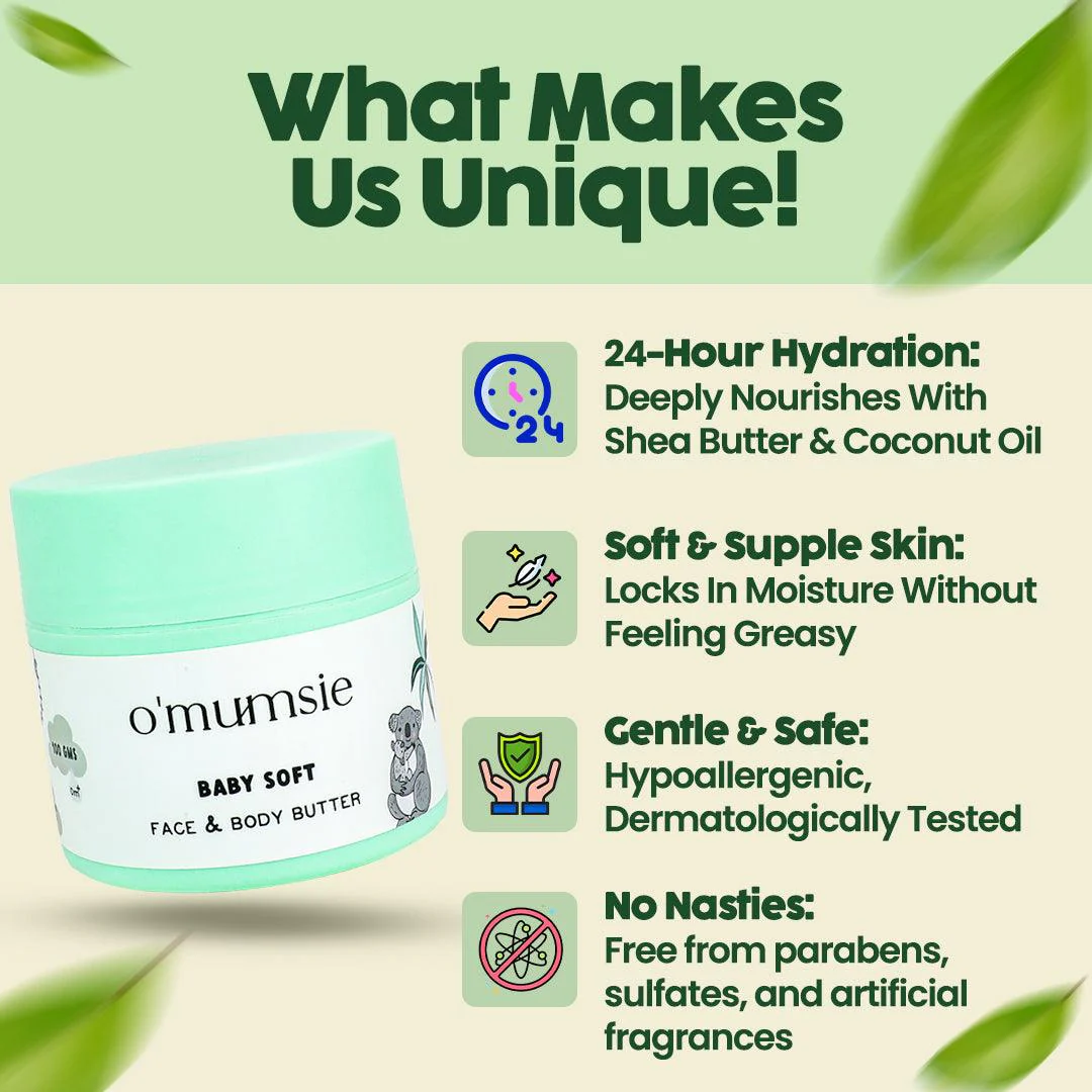 At Omumsie, our baby body butter for dry skin ticks all the boxes. It is made with natural ingredients, provides deep hydration, is easily absorbed, and is free from harmful chemicals and allergens. Our baby body butter is the best baby body lotion price in India, providing you with the best value for your money. Give your baby the care they deserve with Omumsie.